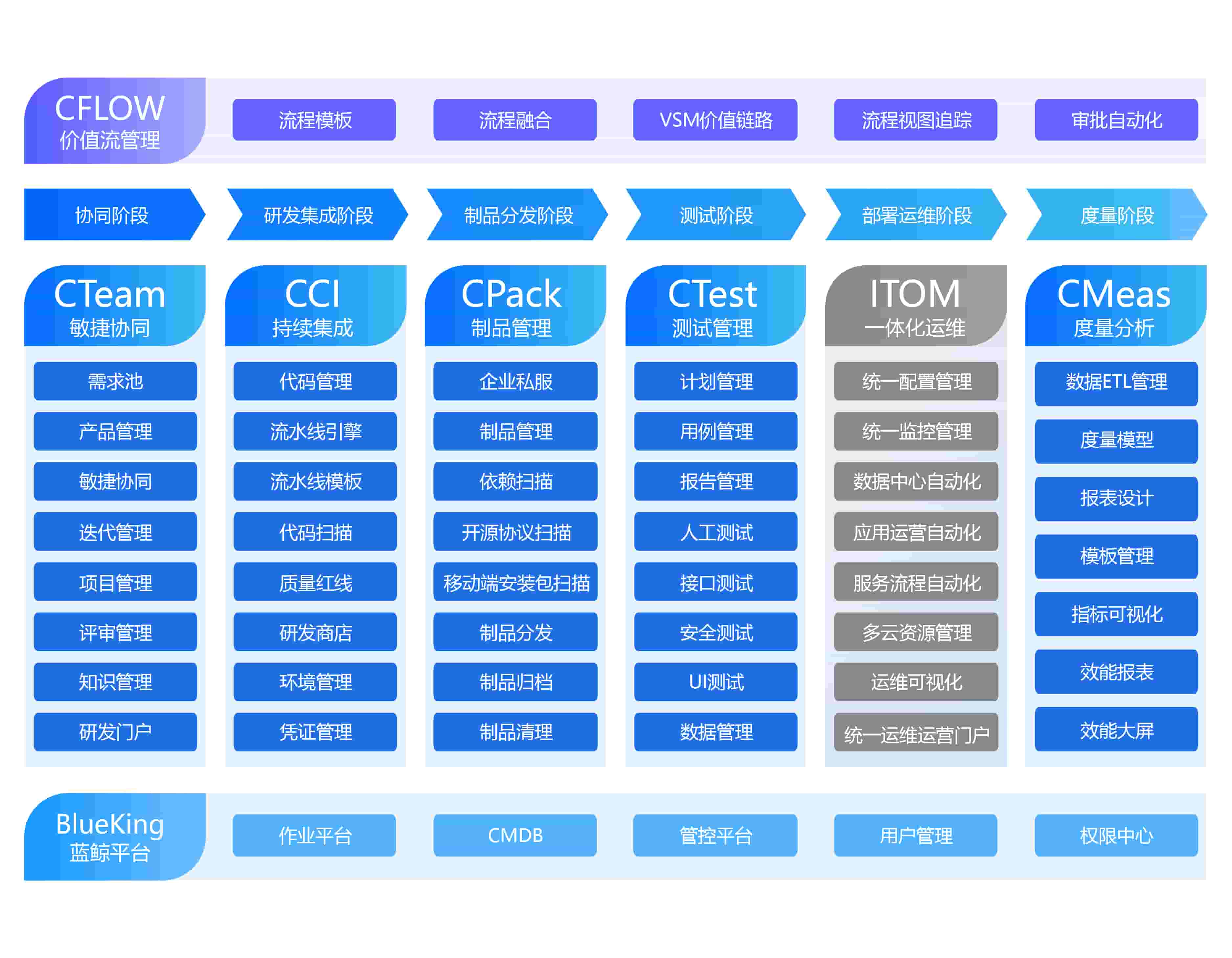 ● 應用能力-CFlow價值流管理:提供企業級研發價值流管理服務。通過自定義“流程 + 插件”的組合能力為研發過程建模,以流程管理能力規范端到端的研發活動價值流,以插件控制能力自動化聯動所有單點平臺。