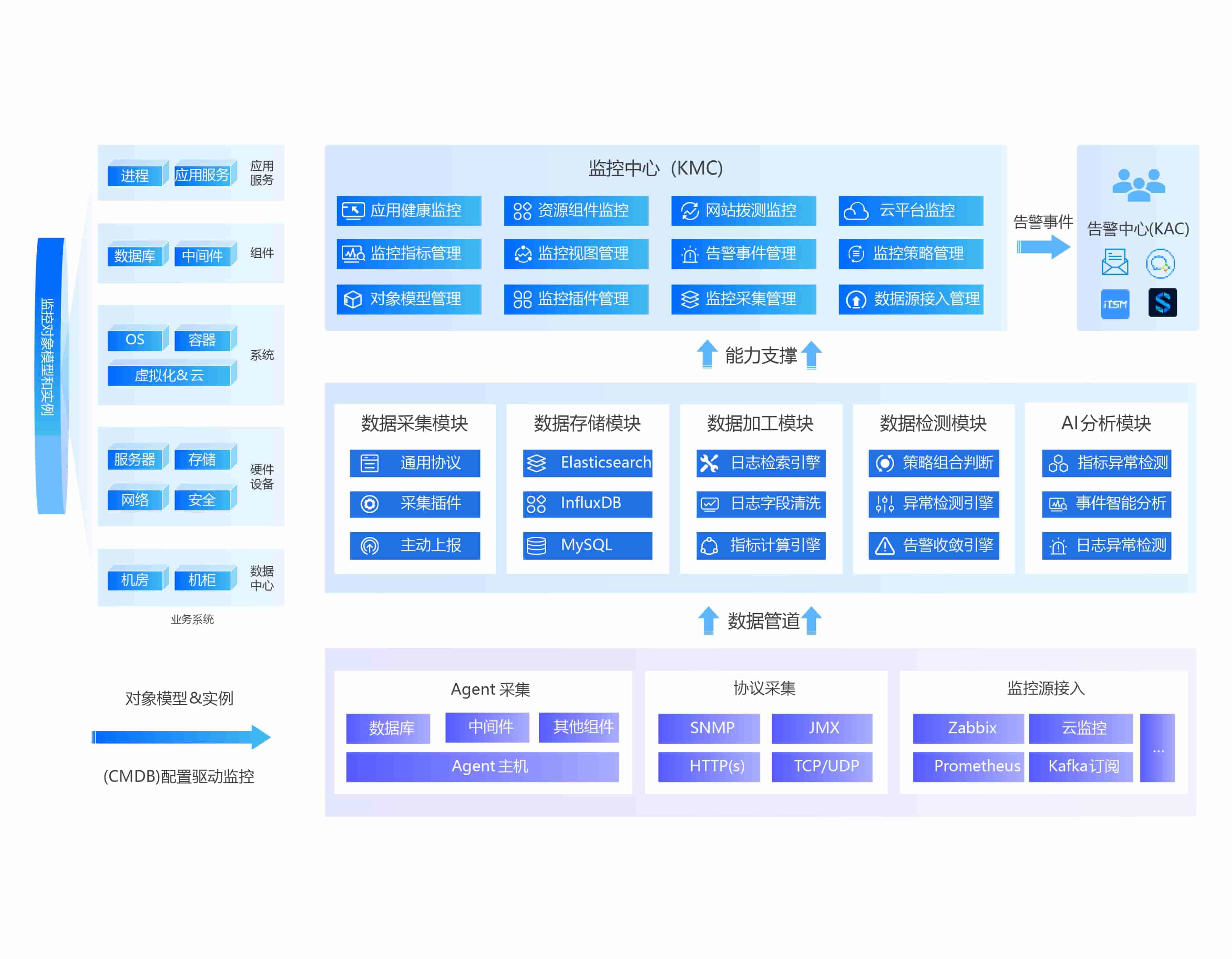 ● 能力層:覆蓋監控通用能力,具備數據采集模塊、數據存儲模塊、數據加工模塊、數據檢測模塊。
