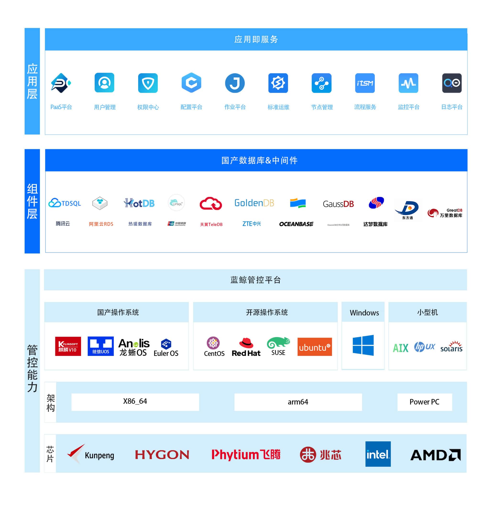 通過Agent海量管控能力和API網(wǎng)關(guān),實現(xiàn)各能力工具和國產(chǎn)組件的集中接入和管理,包括各種國產(chǎn)操作系統(tǒng)、服務(wù)器、數(shù)據(jù)庫和中間件等。