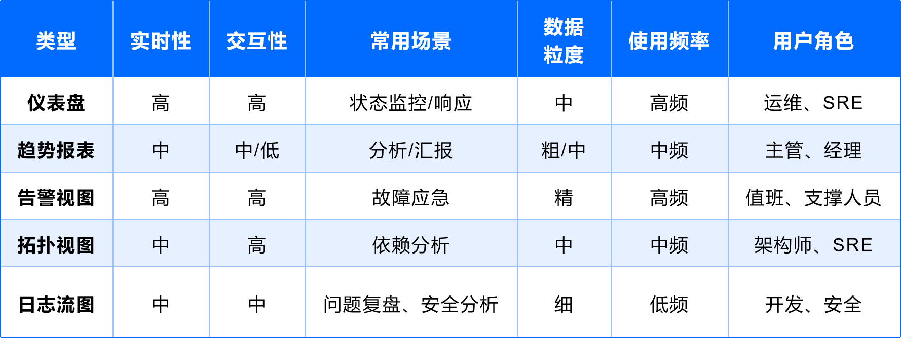 在監控平臺中,“可視化”不止一種表現形式。根據業務關注點、用戶角色和使用場景的不同,可視化大致可分為以下幾種類型。理解這些類型之間的差異,有助于企業更有針對性地設計和建設自己的監控可視化體系。