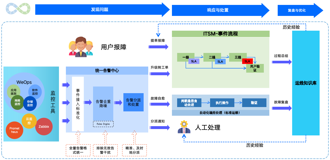 WeOps不僅限于ITSM,致力于實現IT服務、IT流程與運維管理融合的一體化解決方案。