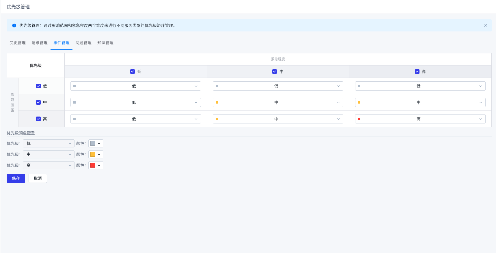 • 通過“影響范圍”和“緊急程度”兩個維度來定義不同類型服務的優先級。