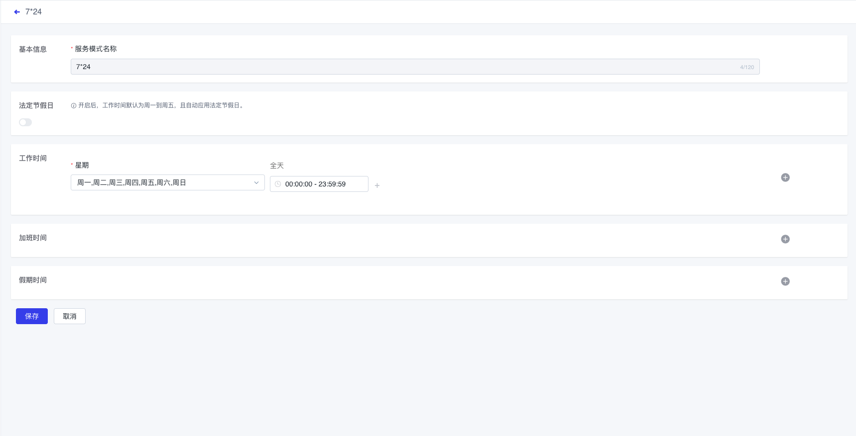 • 通過正常工作時間、加班時間、休假時間三個維度來設置服務模式。