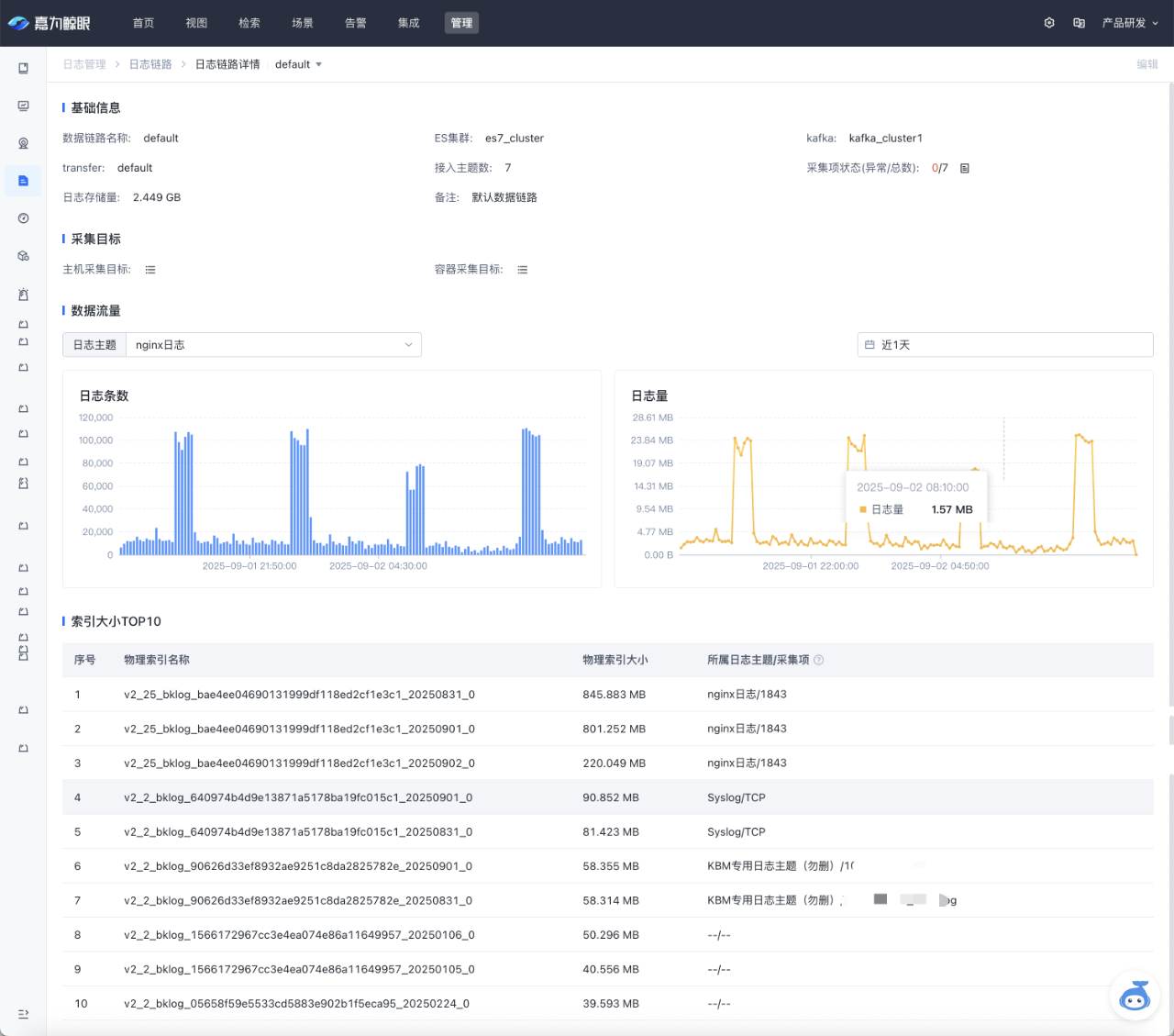 日志采集鏈路的資源使用情況以可視化方式直觀呈現,數據鏈路上的組件資源容量分析、控制調優都能輕松搞定,讓資源管理更清晰、更高效!