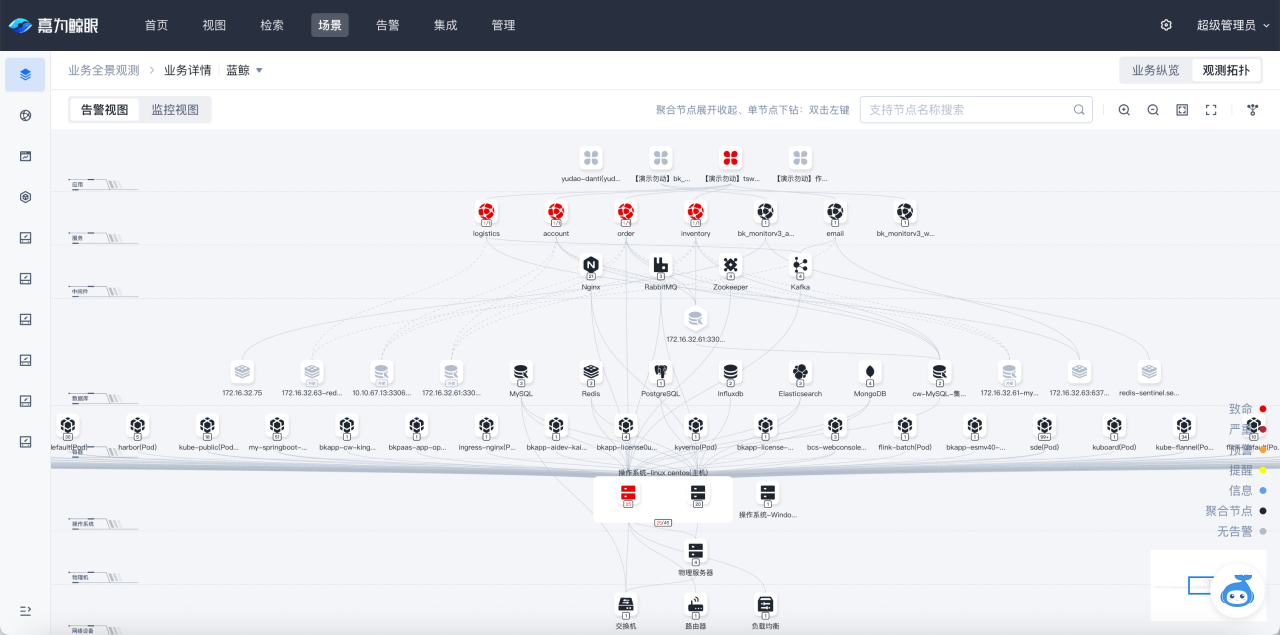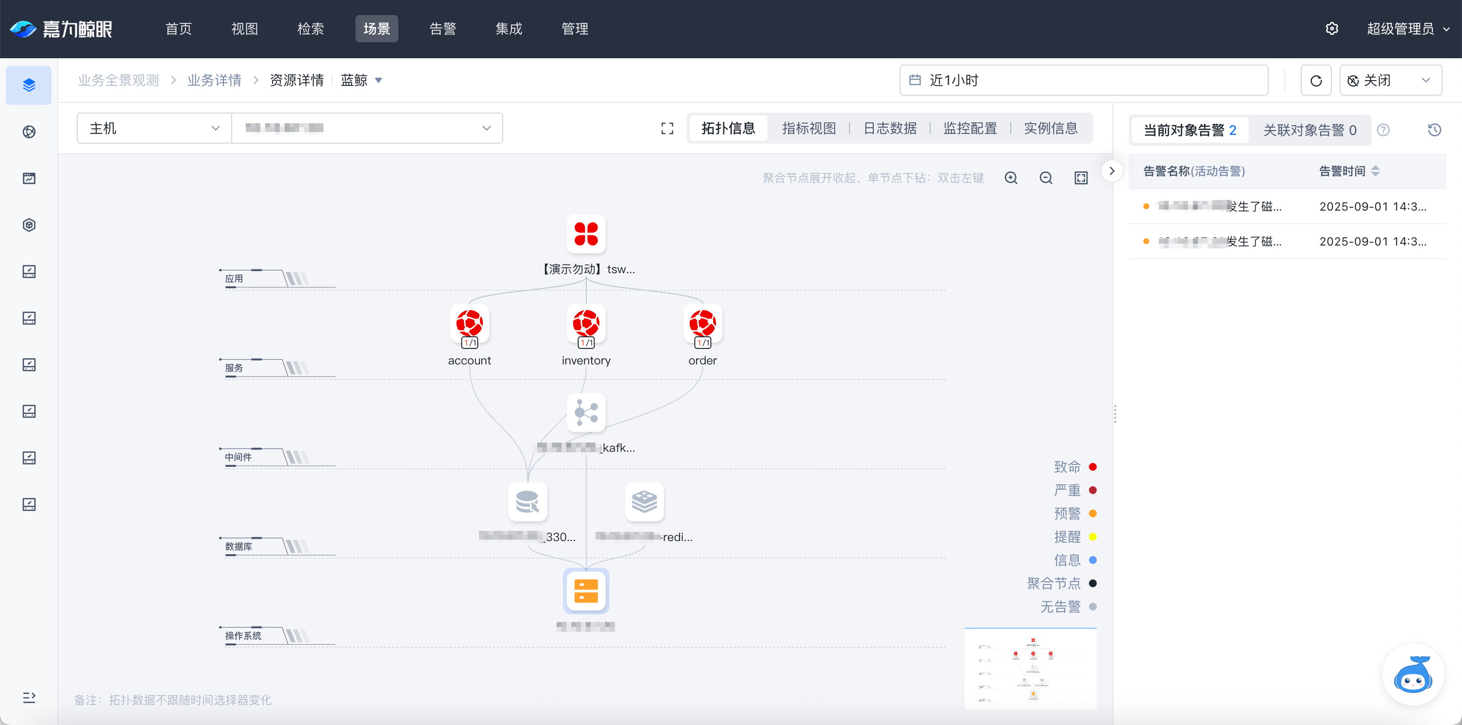 想實時掌握業務全貌?看這張拓撲圖就夠!節點、鏈路清晰呈現,異常狀況一眼鎖定,業務運行狀態、資源上下游關聯盡在掌握。不管是排查故障,還是優化業務架構,有它助力,效率直接拉滿,運維人再也不用為 “摸不清業務脈絡” 頭疼啦!