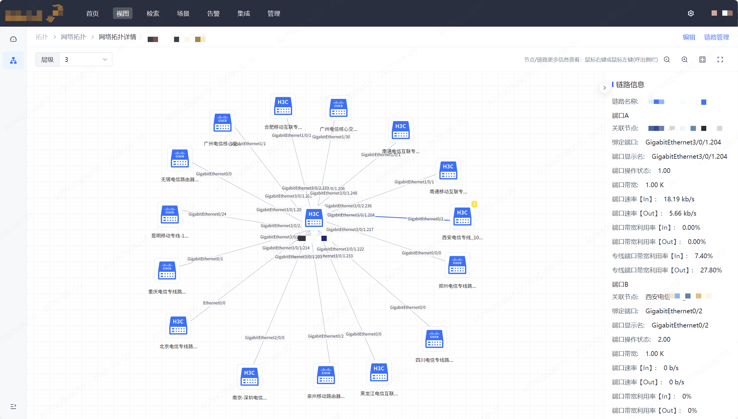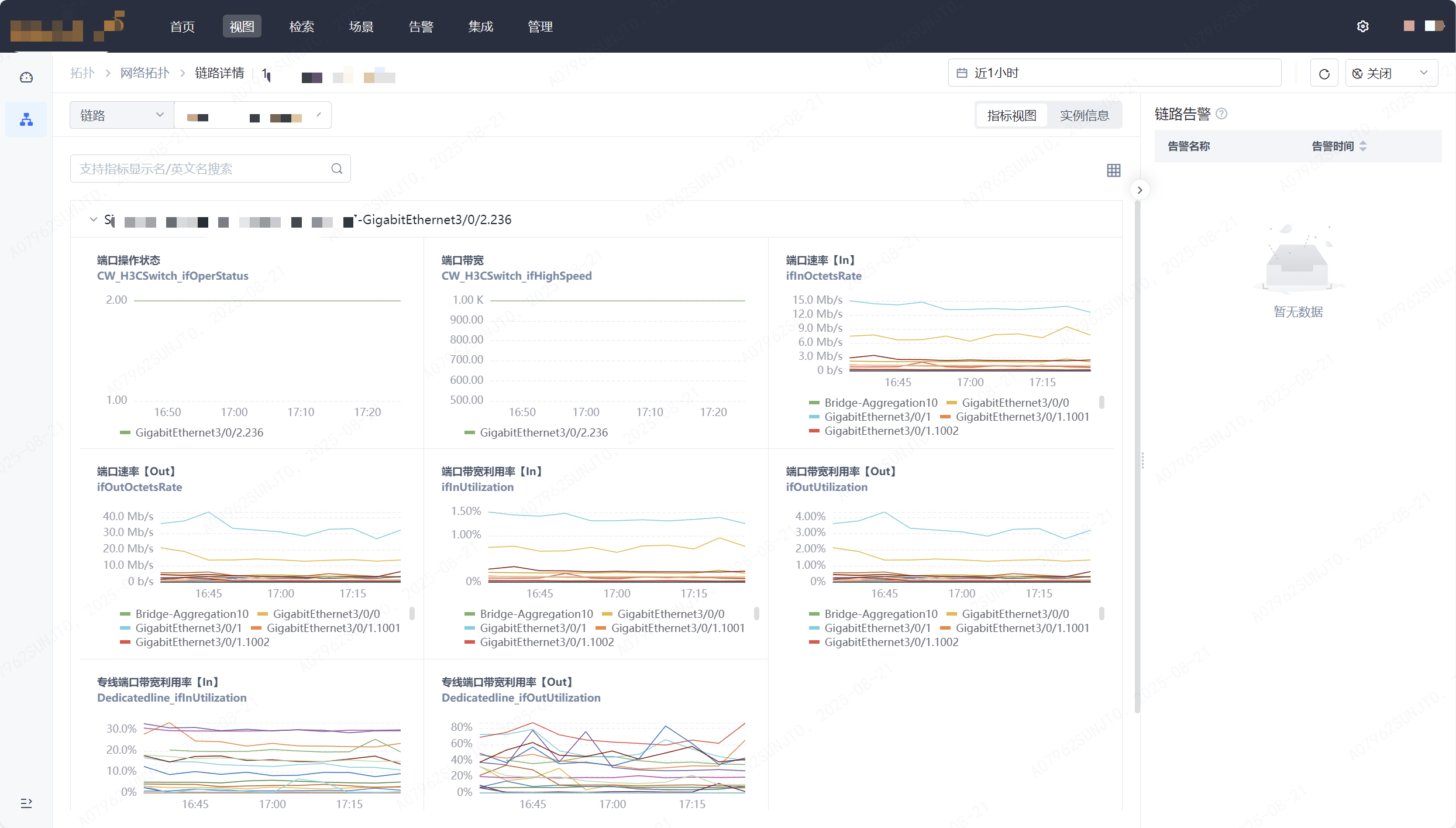 全面監控網絡鏈路的運行狀態,包括端口狀態、帶寬、速率、帶寬利用率等關鍵指標;通過拓撲圖直觀展示鏈路連接關系與關鍵實時數據。支持鏈路信息查詢、指標趨勢分析及告警關聯,可及時發現鏈路擁堵、中斷等問題,保障網絡傳輸通暢,為業務數據流轉提供穩定支撐。