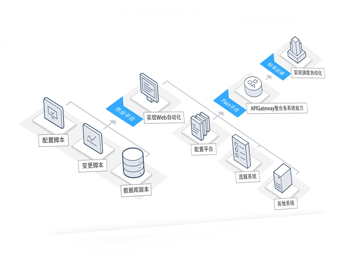 運(yùn)維行業(yè)發(fā)展階段有:手工操作運(yùn)維 ——> 腳本自動(dòng)化運(yùn)維 ——> Web 自動(dòng)化運(yùn)維 ——> 調(diào)度自動(dòng)化運(yùn)維 ——> 智能化運(yùn)維,藍(lán)鯨智云體系已經(jīng)完全經(jīng)歷了前四個(gè)階段的洗禮,通過成熟的產(chǎn)品功能,直接幫助企業(yè)進(jìn)入“調(diào)度自動(dòng)化”,實(shí)現(xiàn)跨系統(tǒng)調(diào)度編排。