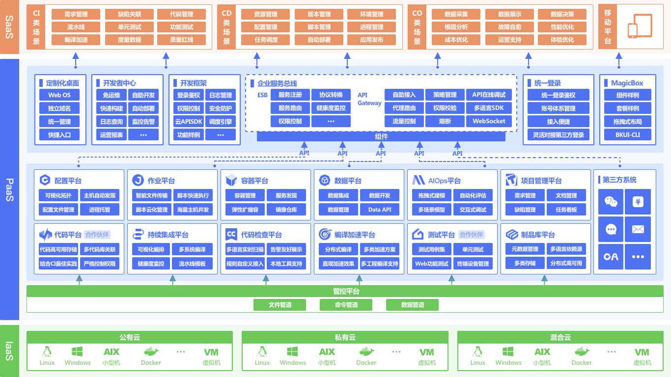 SaaS 層:基于騰訊藍(lán)鯨智云PaaS,可以構(gòu)建覆蓋 CI-CD-CO 領(lǐng)域的 SaaS 場景,打造研發(fā)、運(yùn)維、運(yùn)營一體化管理體系。