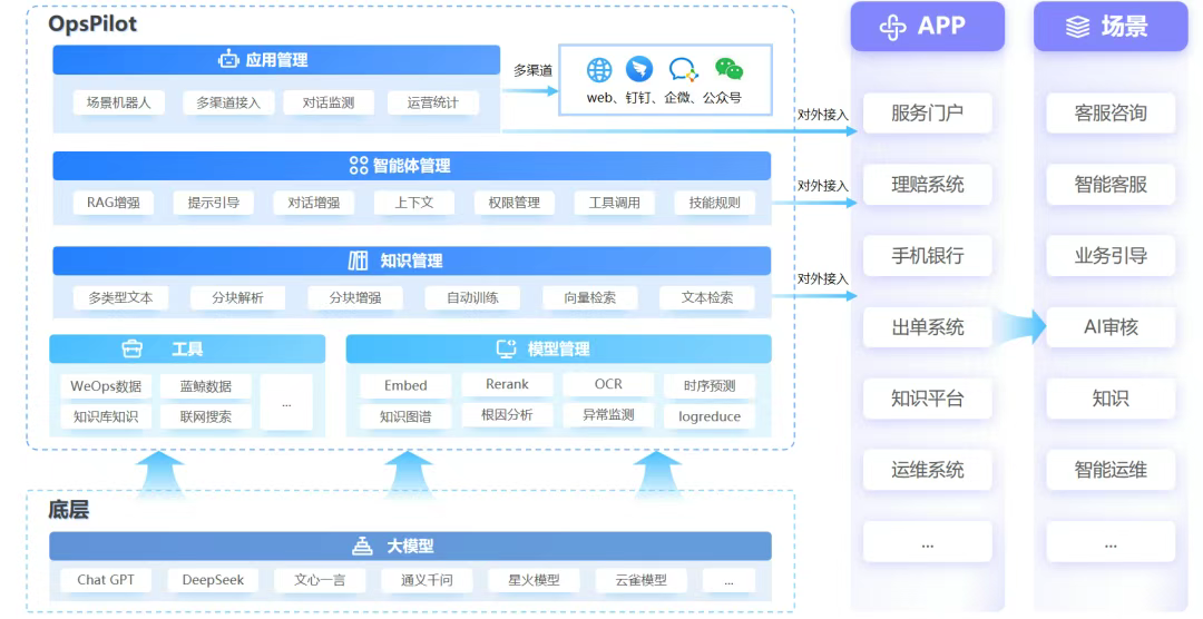 嘉為藍鯨智能運維OpsPilot是集知識庫管理、技能配置、機器人管理及工具管理于一體的智能運維支撐平臺,深度融合LLM大模型的語義理解、知識增強與多模態處理能力,聚焦運維領域,突破單一LLM能力局限,成為更懂運維的智能AI平臺。