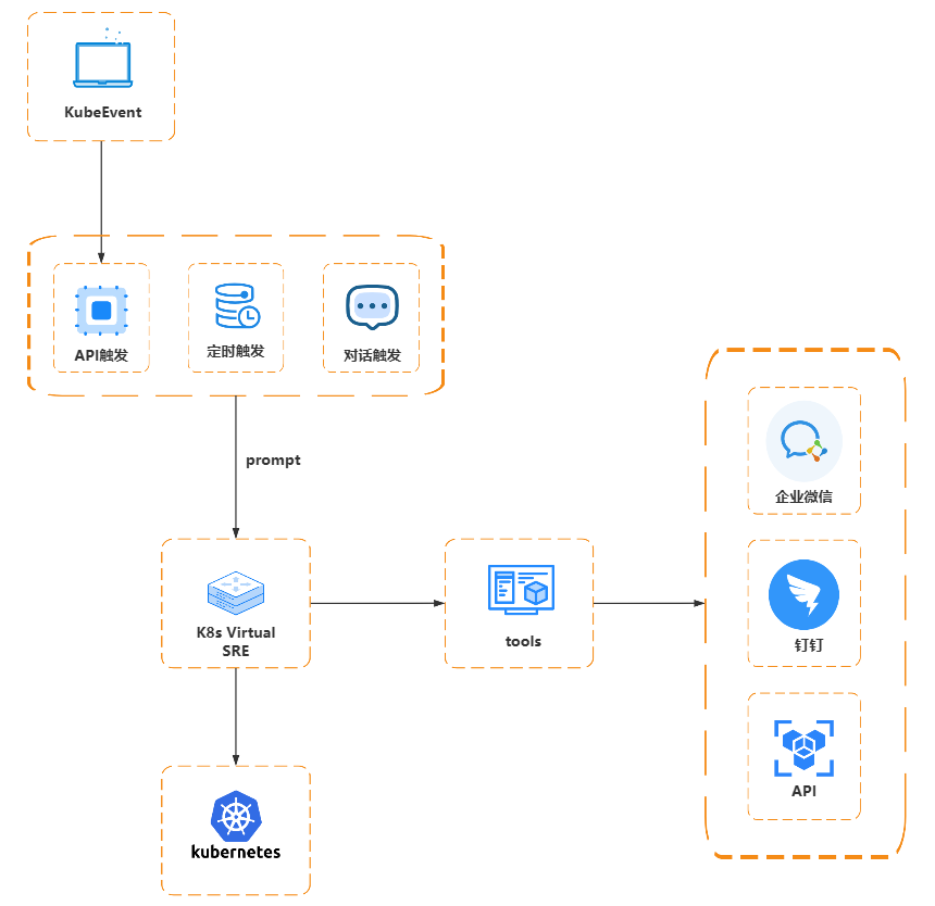 k8s智能體主要有三種使用形態:對話式觸發,定時觸發,API觸發。所有形態均收斂至K8s Virtual SRE,由它協調工具執行和決策。執行過程存在關鍵分叉路徑 ——通知路徑(企業微信/釘釘)支持人工介入場景,而操作路徑(API直連Kubernetes)驅動自動化修復,最終形成從觸發入口到反饋出口的閉環:事件經由SRE與工具協同處理,直達集群操作,實現對Kubernetes環境的秒級敏捷響應,貫穿"診斷-決策-執行"全鏈路。