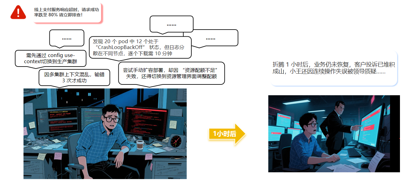 運維工程師小王深夜接到告警:“線上支付服務響應超時,請求成功率跌至80%”。他立刻打開電腦,卻陷入一連串麻煩: