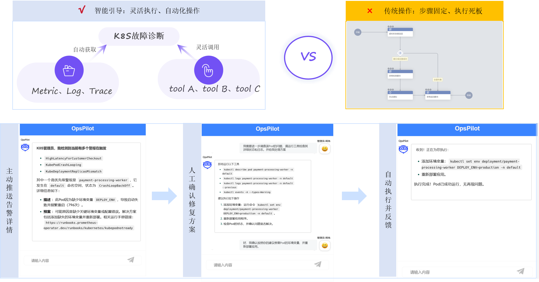 • 智能診斷(LLM/GNN/eBPF技術驅動):融合多維數據(Metric、Log、Trace),靈活調用工具集(如tool A/B/C)實現故障秒級根因定位。突破傳統操作固化模式,執行流程智能化、可定制。