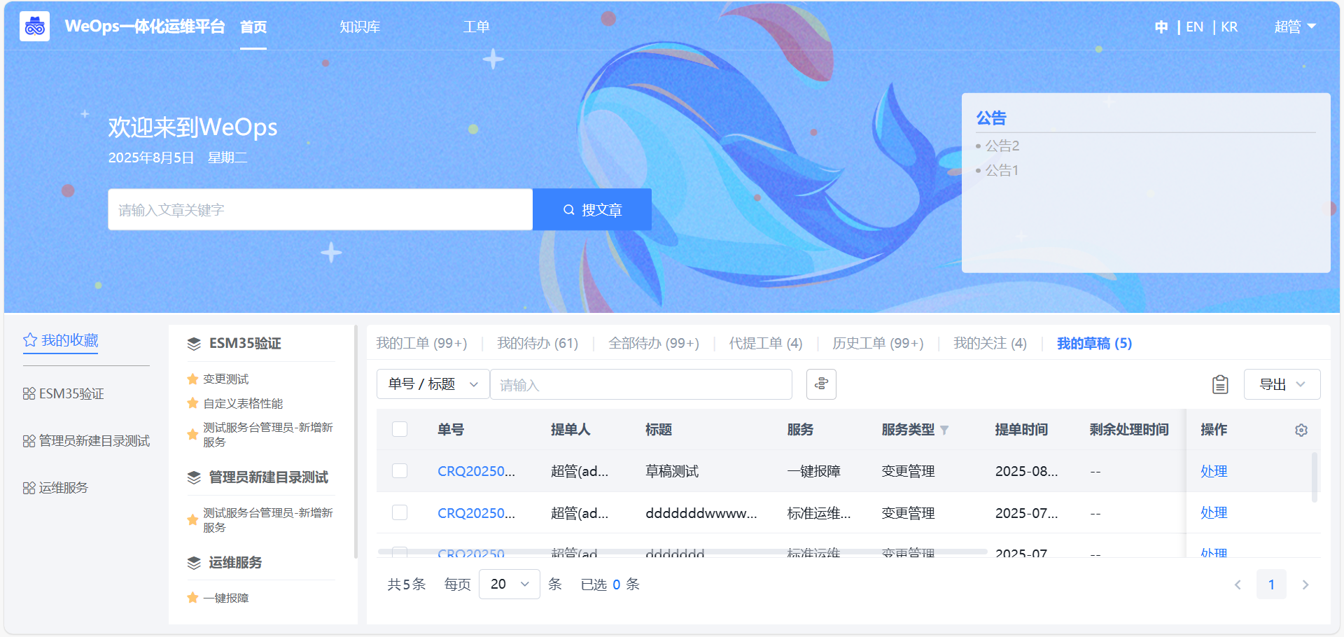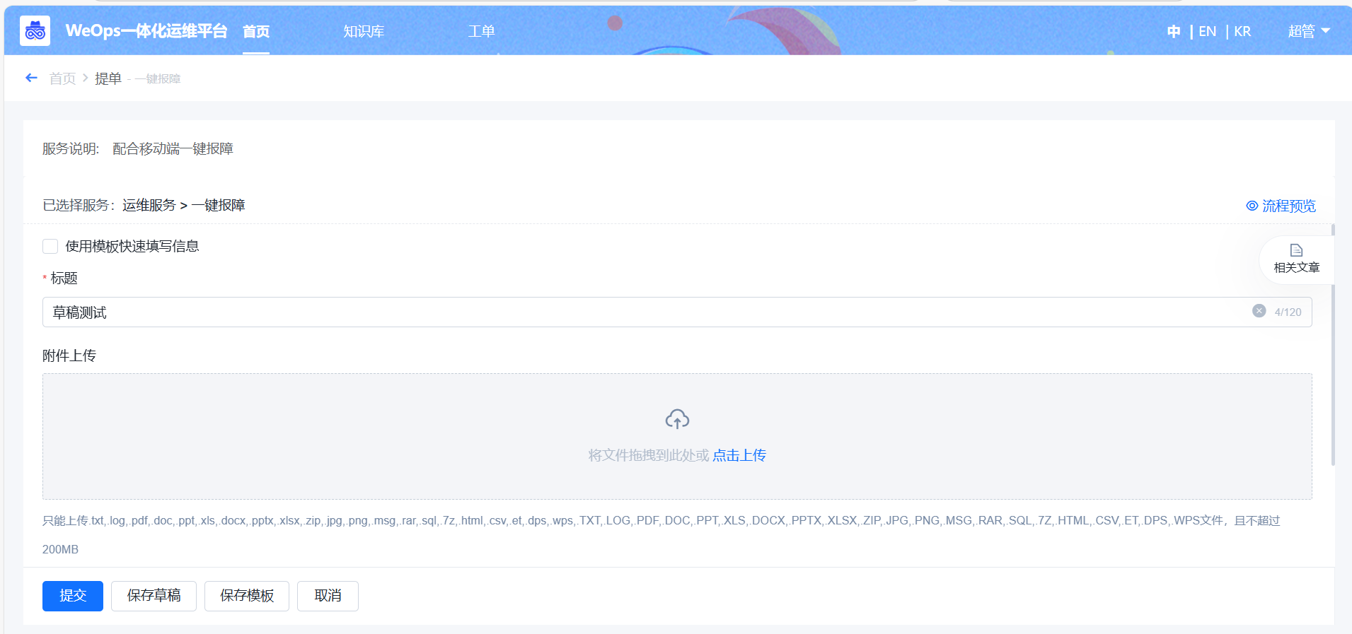 我們了解到用戶在提單過程中經常會遇到因頁面刷新或意外關閉,而丟失辛苦填寫信息的情況。為此,WeOps V4.25新增了工單草稿箱功能,支持隨時保存未完成的工單內容。用戶可在"我的草稿"中快速找回并繼續編輯,避免重復填寫,確保關鍵運維流程不中斷。無論是處理緊急故障還是日常變更,都能讓工單處理更流暢、更高效。