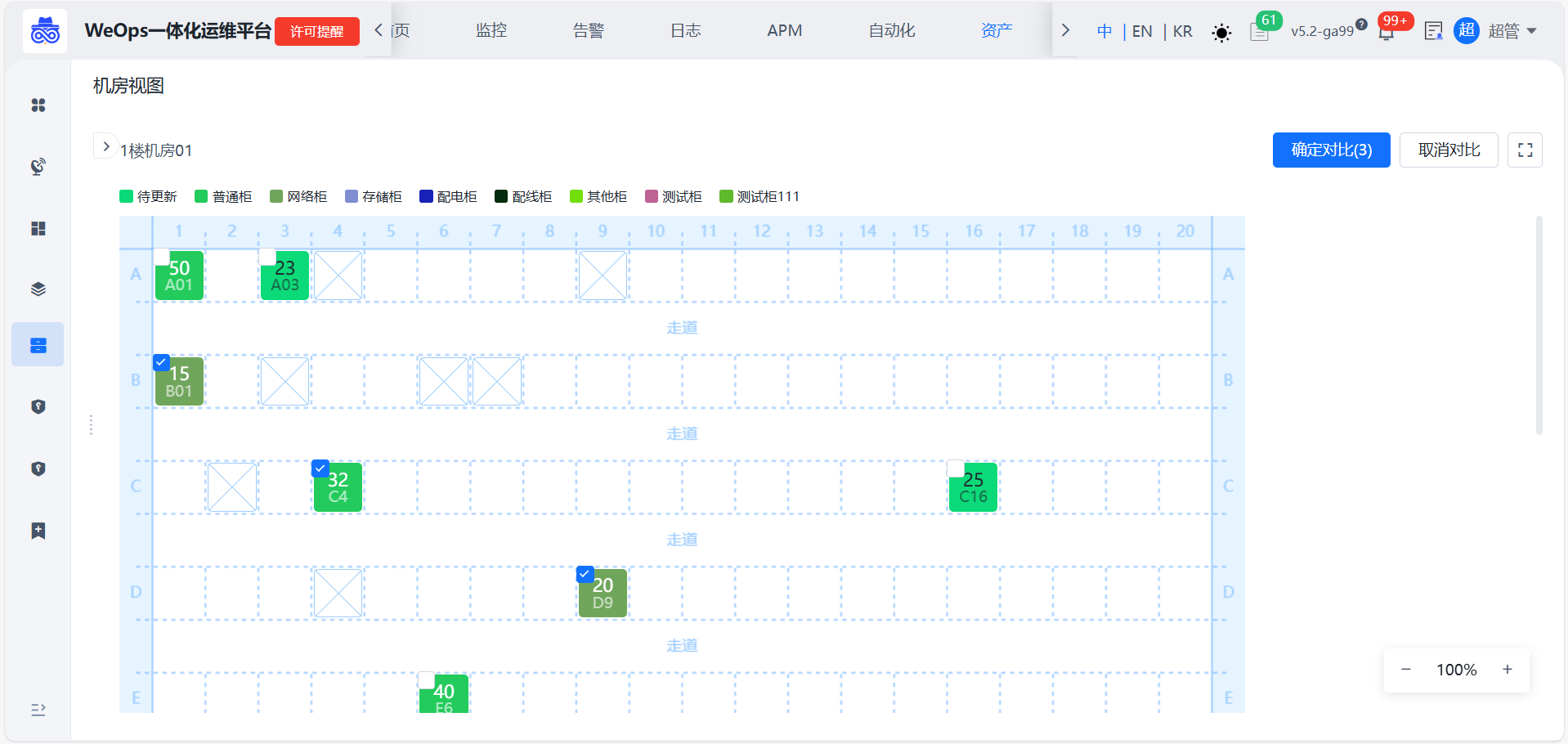 在機房資源緊張時,運維團隊常常需要反復核對多個機柜的剩余空間和承重情況。WeOps V4.25推出的機柜對比視圖功能,支持多機柜并行展示,可直觀呈現設備分布、U位占用等關鍵信息。管理員可一鍵對比多個機柜資源情況,快速找到最優上架位置,有效提升機房空間利用率,告別"選擇困難癥",讓IT資產管理更科學、更高效。