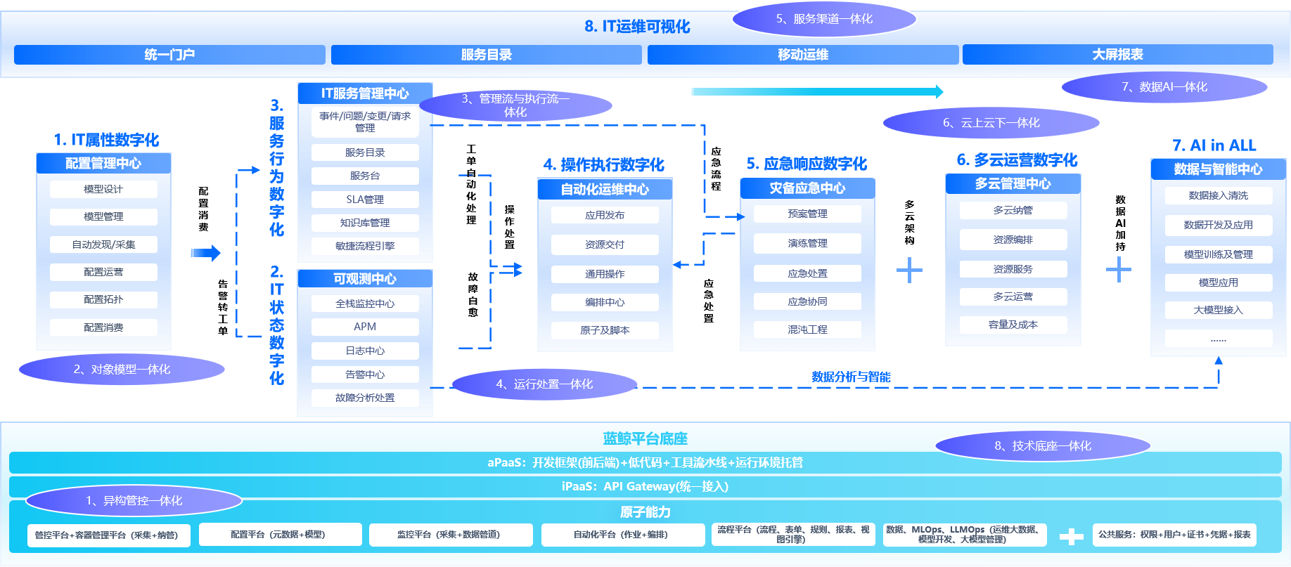 7. 數據與智能中心:深度挖掘運維數據價值,通過 AI 模型預測潛在風險、輔助決策優(yōu)化;