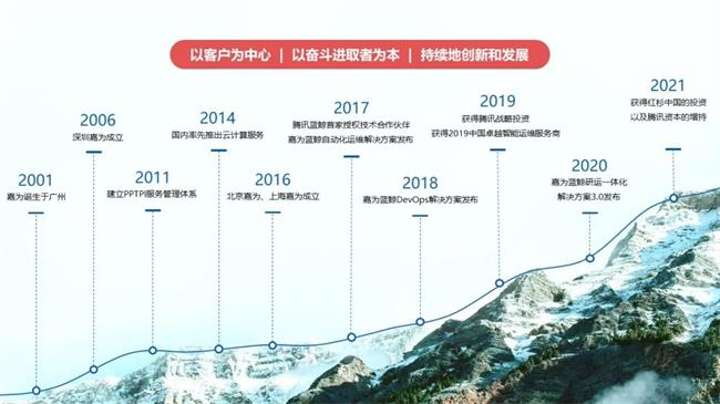 “持續創新與發展”是嘉為的核心價值觀,嘉為從2001年的IT培訓,到2015年轉型為企業提供IT運維管理解決方案,再到2017年成為騰訊藍鯨首家授權技術合作伙伴,提供藍鯨自動化運維解決方案,到2018年的藍鯨DevOps解決方案,2020年的藍鯨研運一體化以及2021年為企業數字化轉型賦能,嘉為科技洞察變化,不斷創新,奮斗進取,持續發展,敏捷調整的戰略布局為企業持續注入新的生命力,高速發展的平臺也驅動著員工跟隨公司的步伐快速地前進。